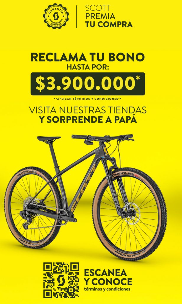 ¡Gran Noticia! SCOTT bicicletas llega a sorprender a su público aficionado al ciclismo con esta nueva actividad promocional donde abrirá todo su portafolio para compras de bicicletas 2022 y 2023 regalándoles un bono de hasta 3´900.000 que podrán redimir en marcas como SCOTT, SYNCROS, LAZER, BRYTON, ELITE, SHIMANO, GW, VITTORIA, PRO, FOX, SQUAD, PX y STAGES, para complementar toda la indumentario o porque no sorprender a alguien más con una bicicleta.