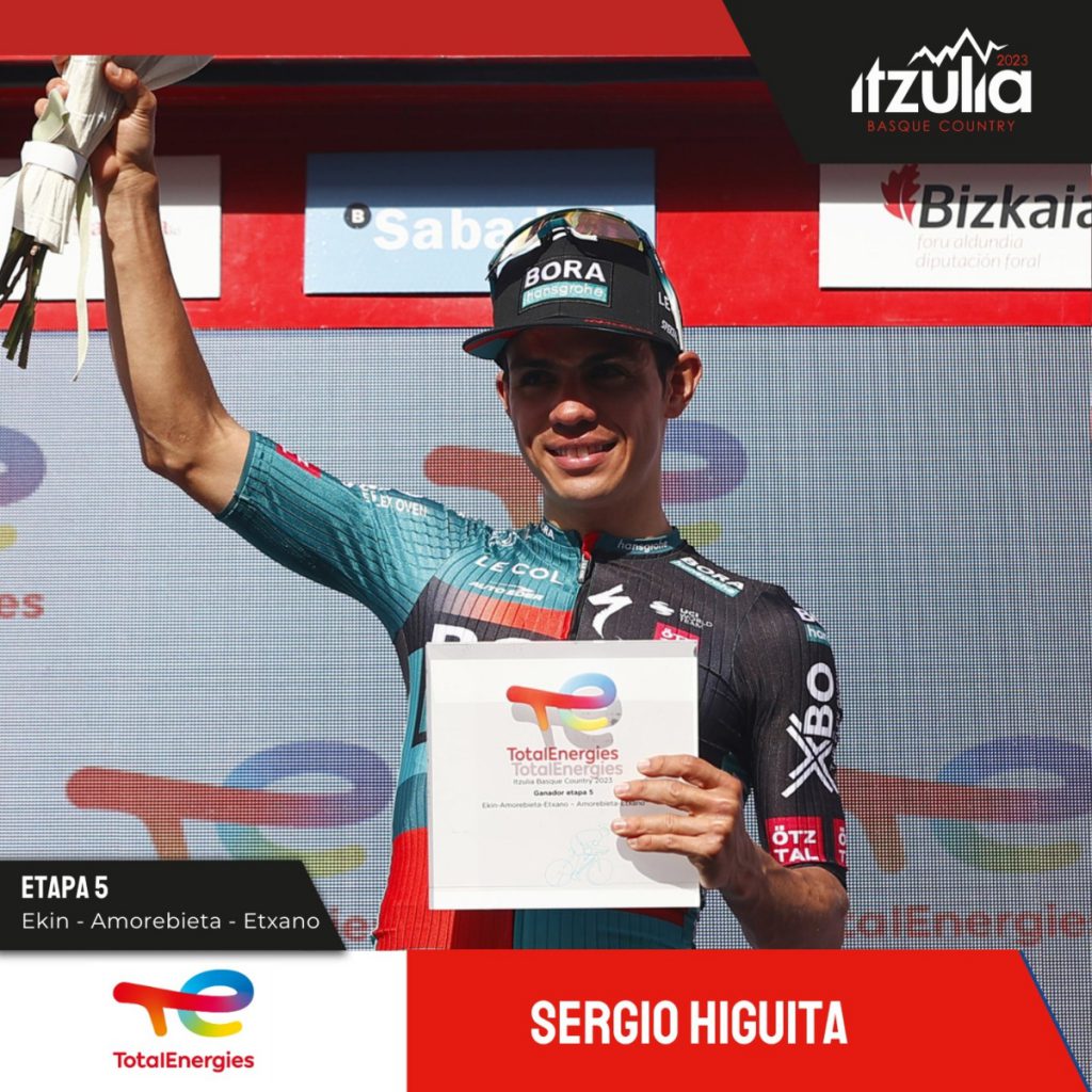 En una espectacular definición, Sergio Higuita (Bora-Hansgrohe) ganó de forma brillante la quinta etapa de la Vuelta al País Vasco 2023, que se disputó sobre 164,5 kilómetros en los alrededores Amorebieta.