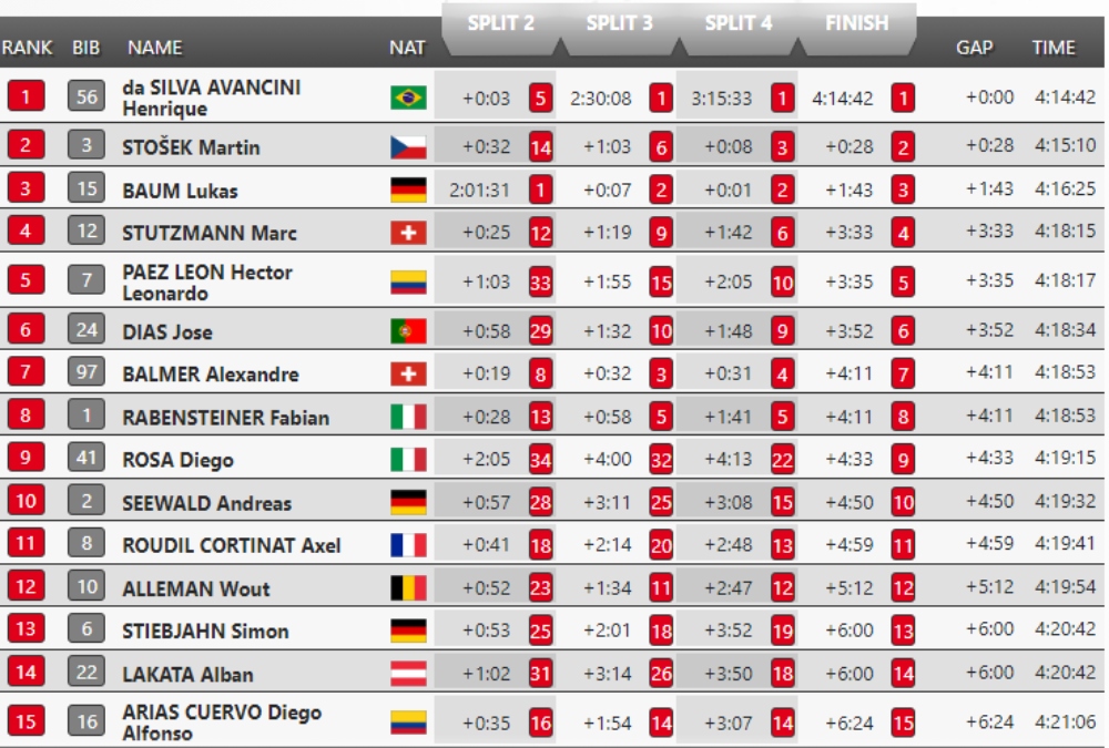 El pedalista suramericano terminó la exigente prueba con un tiempo de 4’14:42″, sacándole 28 segundos al checo Martin Stosek, y 1:43″ al alemán Lukas Baum, que completó el podio. En la cuarta posición entró el suizo Marc Stutzmann a 3:33″ del ganador.