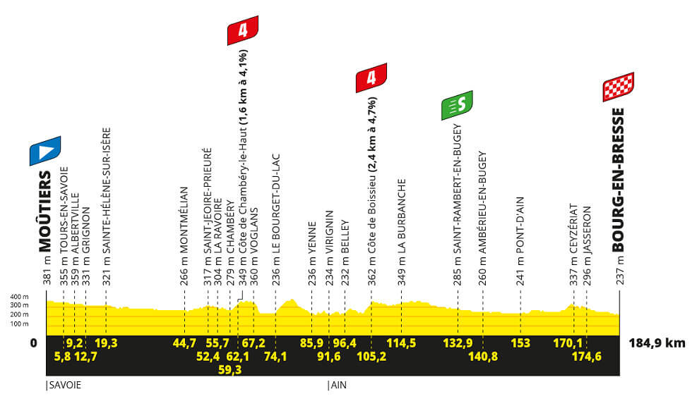 Este jueves se disputará la etapa 18 de la ronda francesa, con inicio en Moûtiers y final en Bourg-en-Bresse, sobre un recorrido de 184,9 kilómetros en terreno llano, que incluye dos ascensos de cuarta categoría.