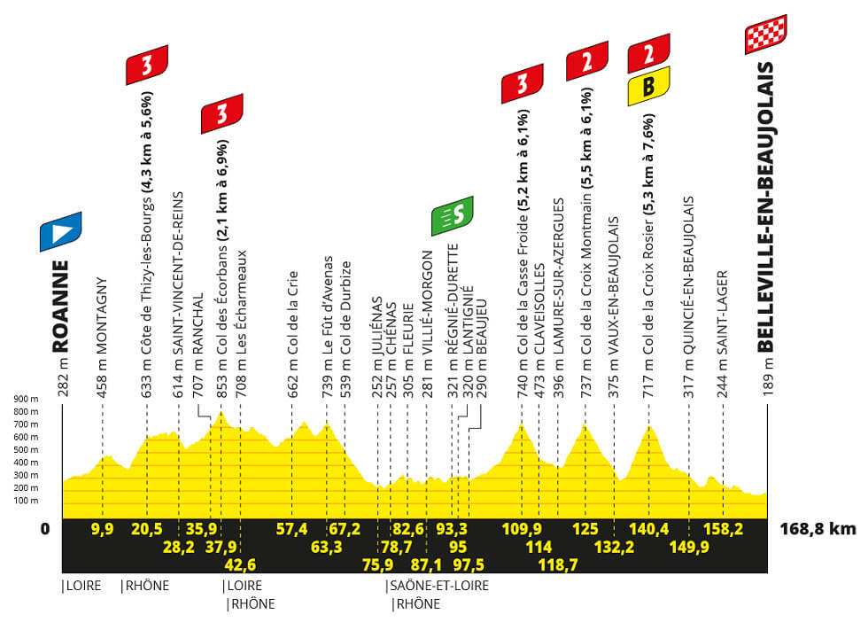 La ronda francesa continuará este jueves 13 de julio con la etapa 12, una jornada de media montaña con 168,8 kilómetros entre Roanne y Belleville-en-Beaujolais, que incluye cinco puertos montañosos categorizados.