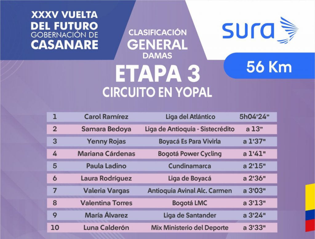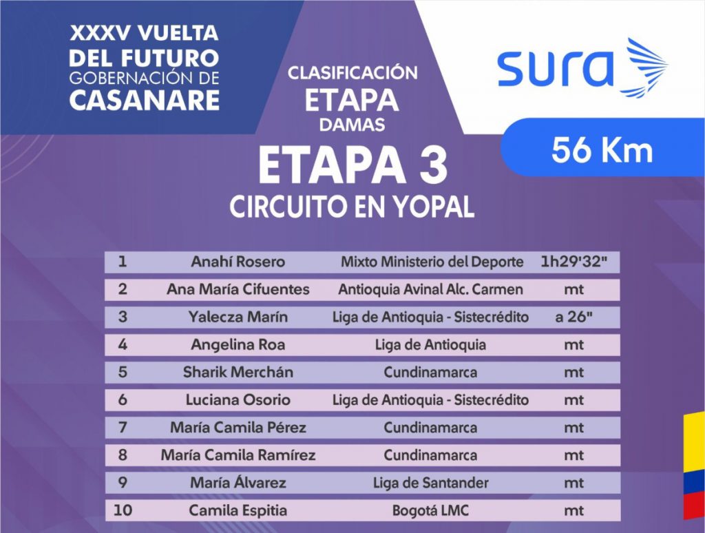 Anahí Rosero gana en Yopal la tercera etapa de la Vuelta del Futuro; Carol Ramírez firme en el liderato