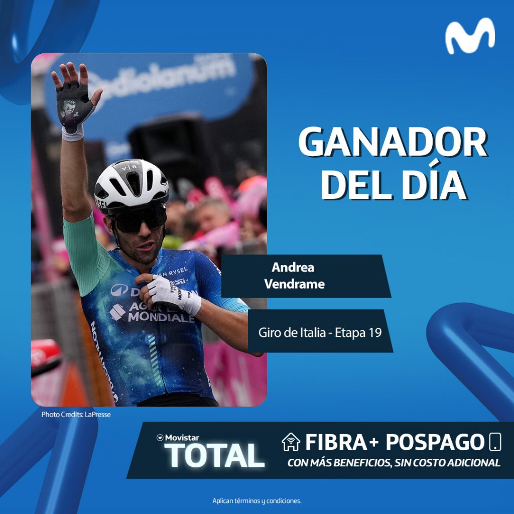 ¡Coronó la fuga! El italiano Andrea Vendrame (Decathlon AG2R La Mondiale Team) salió victorioso en la decimonovena etapa del Giro de Italia tras recorrer 157 kilómetros entre Mortegliano y Sappada. Sus compañeros de fuga el español Pelayo Sánchez y el alemán Georg Steinhauser terminaron en el segundo y tercer lugar, respectivamente.