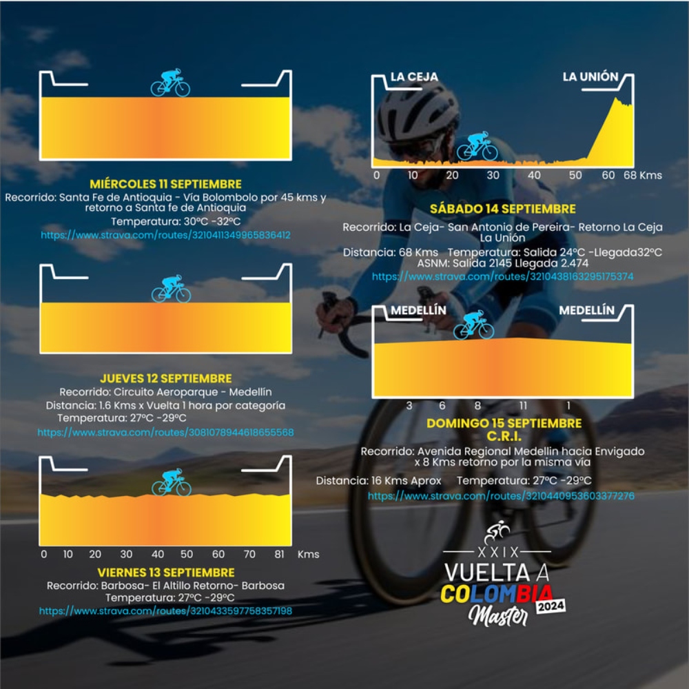 La carrera finalizará el domingo 15 de septiembre con una contrarreloj individual de 16 kilómetros por la Avenida Regional Medellín hacia Envigado, donde conoceremos a los campeones de las diferentes categorías.