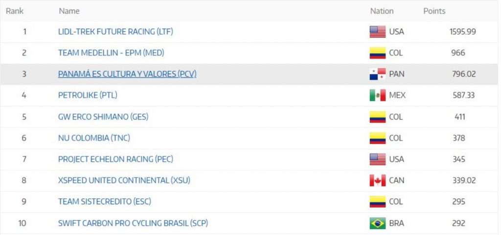 La formación antioqueña solo terminó por detrás del Lidl Trek Future Racing en el escalafón. En lo que refiere a los otros conjuntos colombianos, el GW Erco Shimano terminó 5°, el Nu Colombia 6° y el Team Sistecrédito 9°.