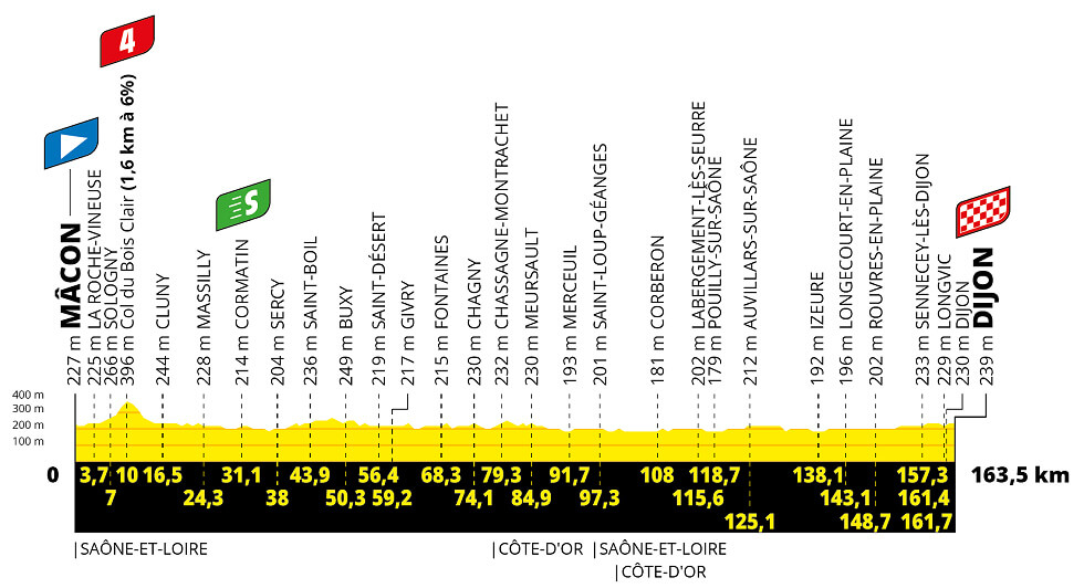 La ronda francesa continuará este jueves con su sexta etapa, otro parcial llano, que se disputará entre Mâcon y Dijon con 163,7 kilómetros de recorrido. Durante el trayecto el pelotón se enfrentará a un puerto de cuarta categoría en la fase inicial.