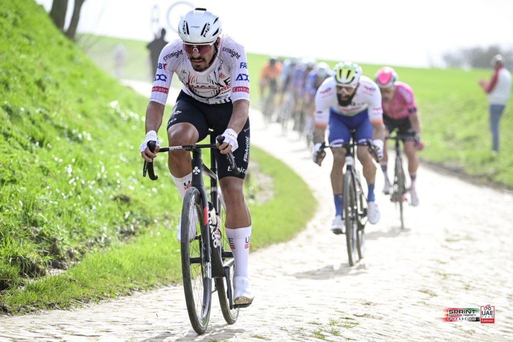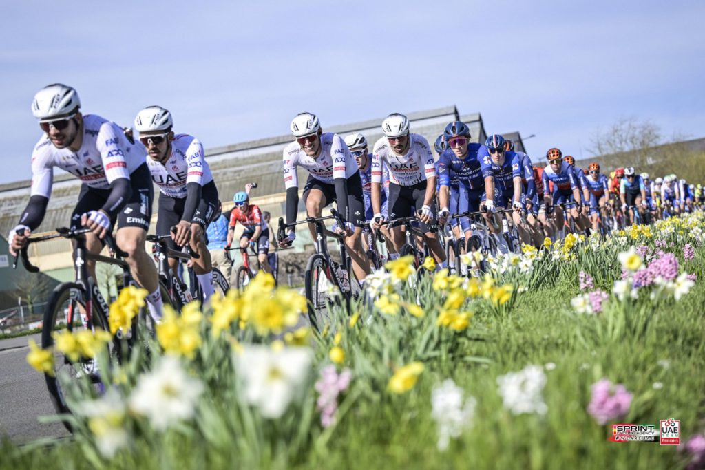 En el pelotón, una docena de corredores, entre ellos Arnaud De Lie, el campeón defensor el paipano Juan Sebastián Molano y su compañero de equipo Filippo Baroncini marcaron el ritmo. Este último no esperó y pronto se fue por su cuenta en busca de los tres fugitivos, en una misión imposible.