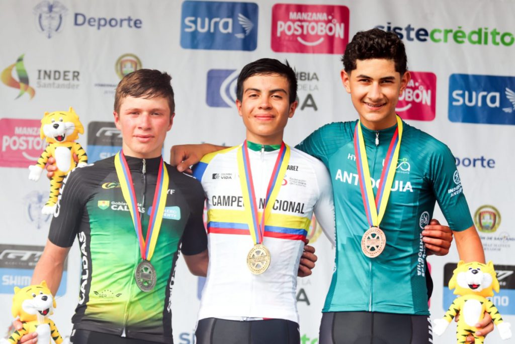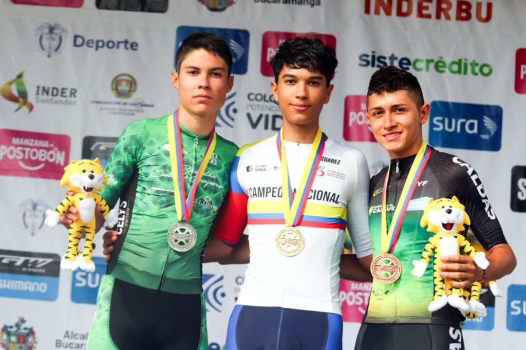 Los primeros en salir a escena fueron los juveniles. En esta categoría fue Juan Diego Quintero, del Team Sistecrédito, quien se coronó como nuevo campeón nacional juvenil de la ruta. El podio lo completaron Juan Miguel Díaz (Risaralda) y Juan David Restrepo (Caldas).