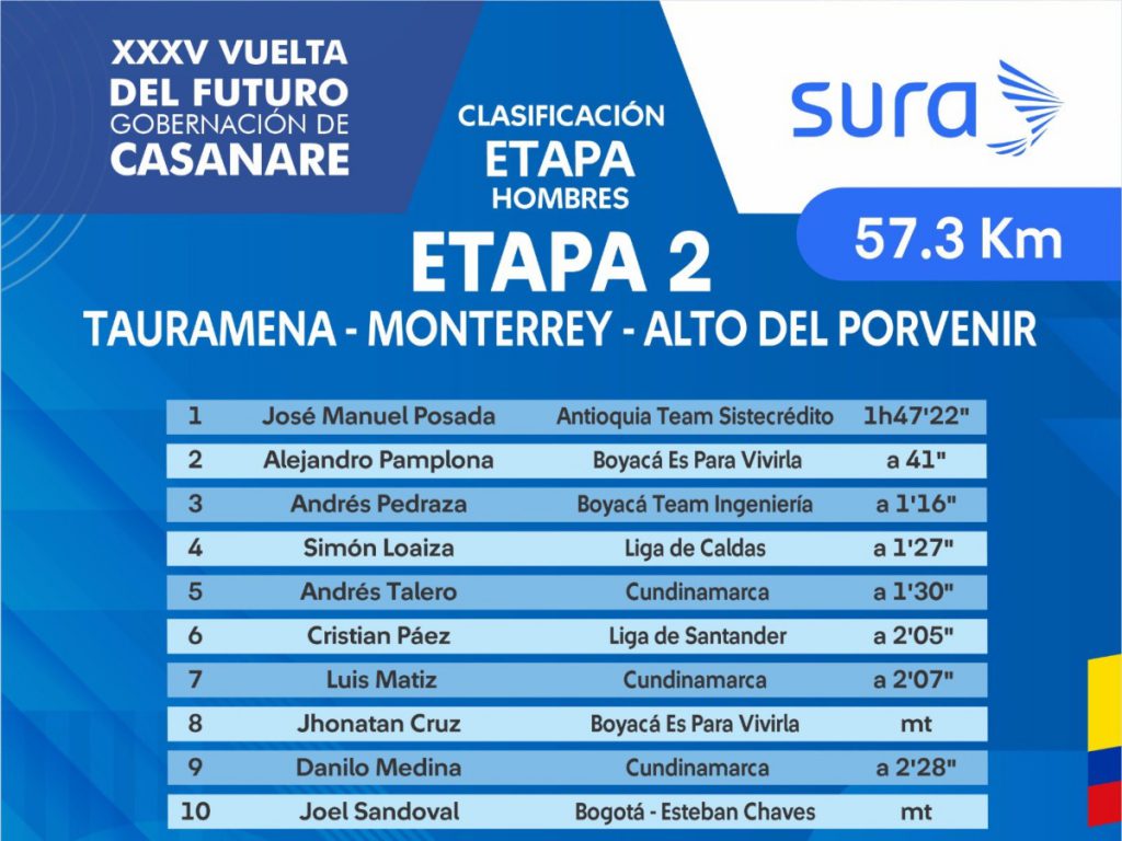 El antioqueño, de 16 años, fue el más fuerte en el ascenso que definió la jornada, superando por 41 segundos a Alejandro Pamplona (Boyacá es para Vivirla) y por más de un minuto a Andrés Felipe Pedraza (Team Ingeniería de Vías), quienes llegaron segundo y tercero, respectivamente.