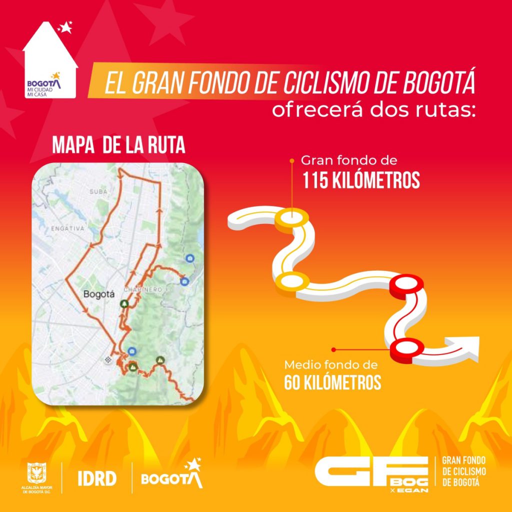 El Gran Fondo de Ciclismo de Bogotá ofrecerá a los participantes dos rutas: un gran fondo como evento principal, alrededor de los 115 kilómetros y un medio fondo entorno a los 80, para los que quieran una experiencia menos exigente pero también disfrutar de este trayecto por las calles de la ciudad. El recorrido, que promete una jornada inolvidable, comenzará en la tradicional Plaza de Bolívar y pasará por 10 localidades de la ciudad, incluyendo Candelaria, Santa Fe, Chapinero, Usaquén, Suba, Engativá, Fontibón, Kennedy, Teusaquillo y Mártires.