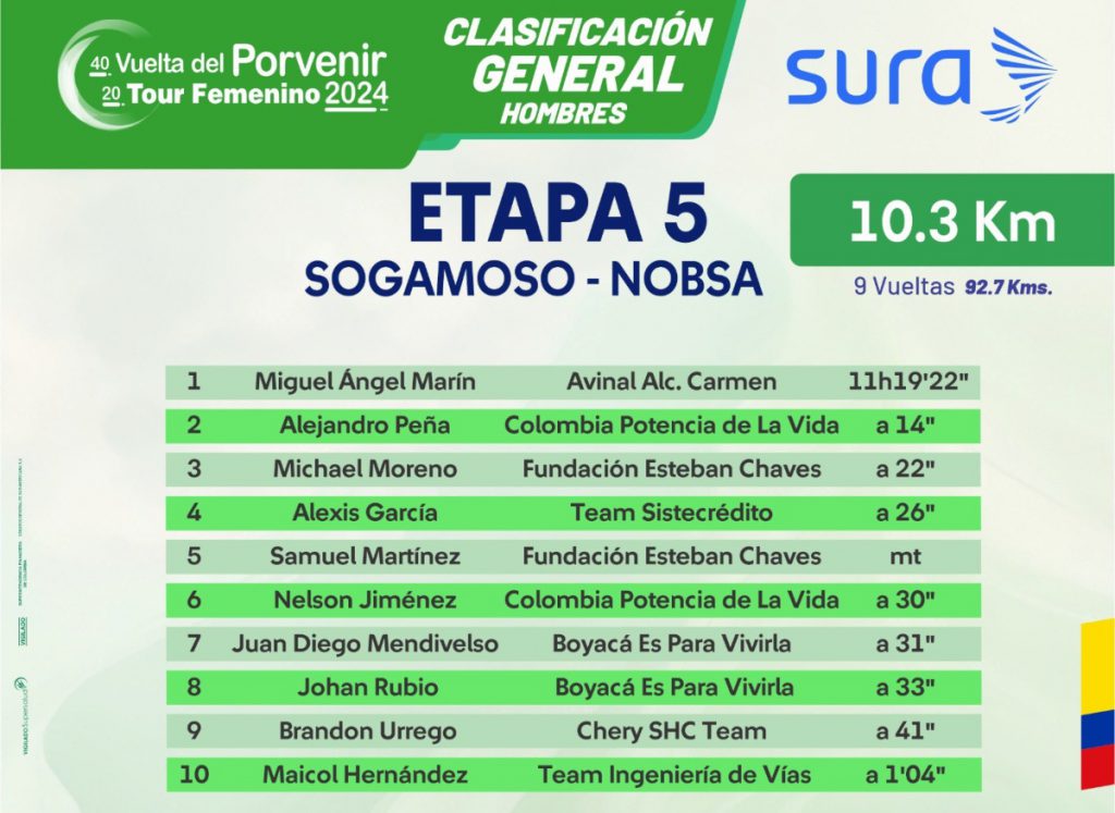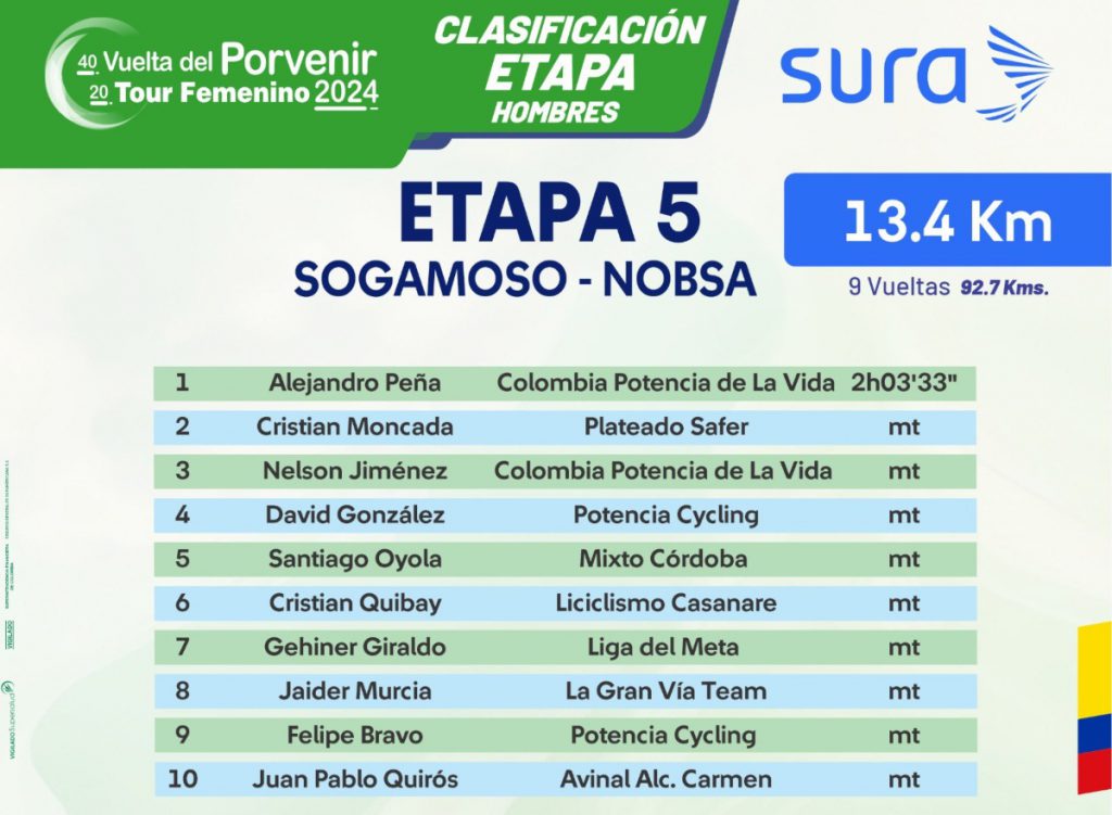 La última victoria de etapa se la llevó en el municipio de NobsaAlejandro Peña (Colombia Potencia de la Vida), por delante de Cristian Moncada (Plateado-Safer) y de su compañero de equipo Nelson Jiménez.