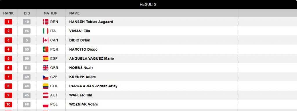El top 5 de la prueba lo completaron el portugués Diogo Narciso y el español Mario Aguela. Por delante del pistero colombiano también terminaron el británico Noah Hobbs y el checo Adam Krenek.