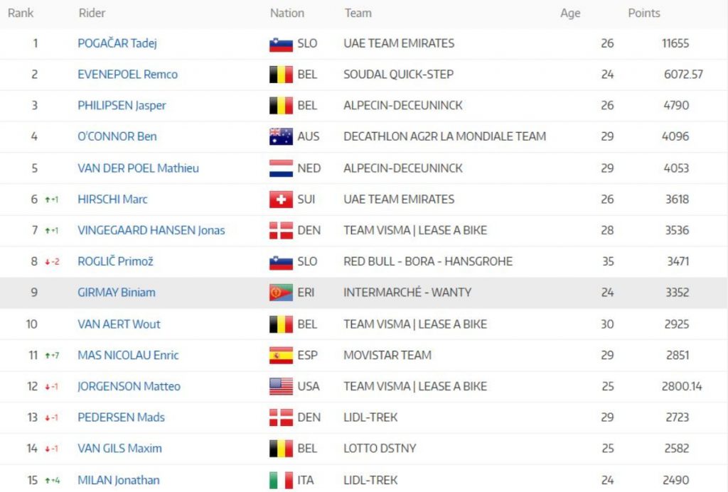 Al ganador del Giro y del Tour, lo escoltan los belgas Remco Evenepoel (6.072) y Jasper Philipsen (4.790). Mientras que, Daniel Felipe Martínez se mantuvo como el mejor colombiano de la lista, en la casilla 34° con 1.855 puntos.