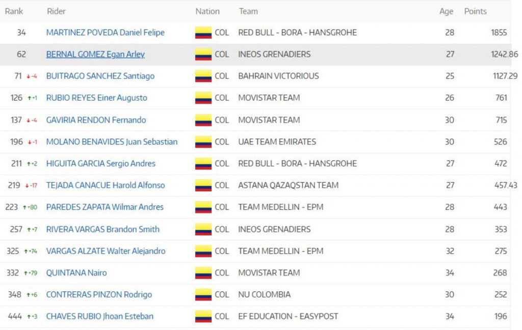 En cuanto al resto de los nacionales, Egan Bernalconservó el puesto 62° con 1.242 puntos. Le siguen Santiago Buitrago en la casilla 71°, quien bajó 4 lugares y Einer Rubio en la posición 126°.