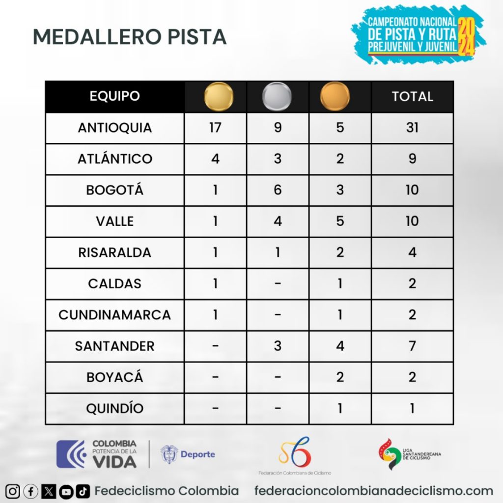 Antioquia llegó así a 31 medallas en total. 17 de oro, 9 de plata y 5 de bronce y a falta de una jornada ya es campeona de la pista. Este viernes se entregarán 10 oros, 6 en la categoría juvenil y 4 en la prejuvenil.