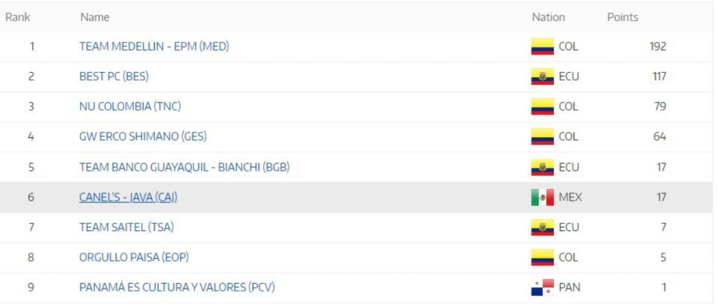 Esto le permitió sumar 192 puntos UCI que lo tienen liderando la clasificación mundial por equipos. Al conjunto dirigido por José Julián Velásquez lo escolta el elenco ecuatoriano Movistar-Best PC con 117 puntos. El tercer puesto lo ocupa el Nu Colombia con 79 unidades y en el 4° puesto se clasifica el GW Erco Shimano con 64 puntos.