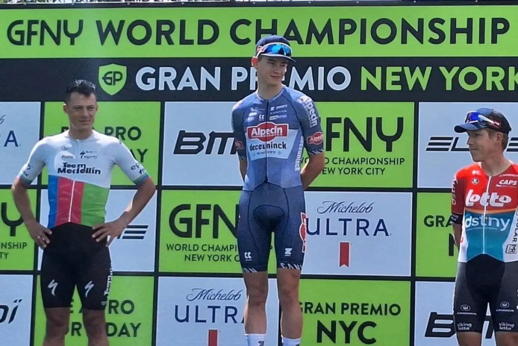 Wilmar Paredes, Johannes Adamietz y Tibor del Grosso, ganador del Gran Premio New York City 2024. (Foto © Team Medellín-EPM)