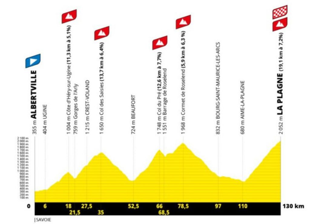 La alta montaña se despedirá en la etapa 19, dos días antes de la llegada a los Campos Elíseos, con una meta en La Plagne y sus 19,1 kilómetros al 7,2 % de pendiente media, que la carrera no visitaba desde la victoria del neerlandés Michael Boogerd en 2002 y donde también ganaron el francés Laurent Fignon y el suizo Alex Zulle.