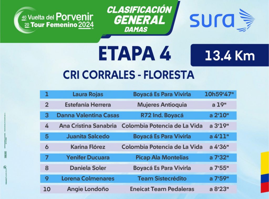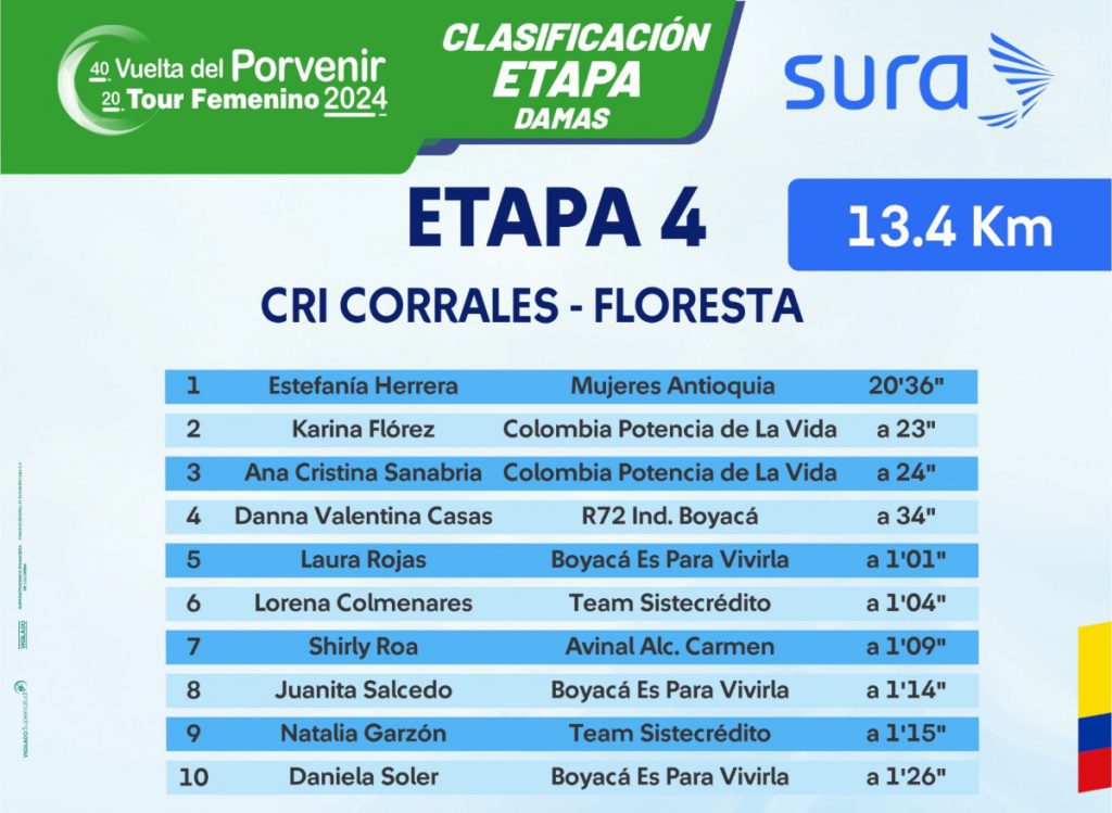 Herrera, que viene de ganar dos etapas, superó por 23 segundos a Karina Flórez (Colombia Potencia de la Vida) y por 24 segundos a Ana Cristina Sanabria (Colombia Potencia de la Vida), quienes quedaron 2° y 3°, respectivamente.