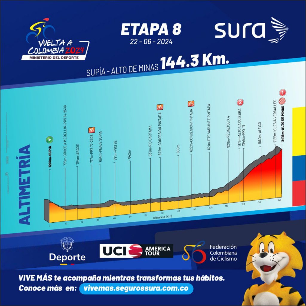 ETAPA 8 – 22 DE JUNIO Recorrido: Supía – Cruce La Felisa – Cruce Marmato – La Pintada – Puente Iglesias – Regreso PR 21 –– La Pintada – Santa Barbara – Versalles – Alto de Minas – 144,3 kilómetros