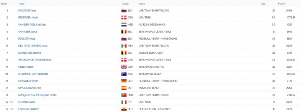 El escalafón, que tiene en cuenta los resultados en todas las carreras UCI de las últimas 52 semanas, sigue liderado sobradamente por el esloveno Tadej Pogacar (UAE Team Emirates), quien sigue en lo más alto con 11.465 puntos.