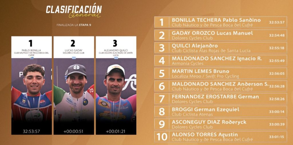 El campeón panamericano de Marathon superó en la definición al charrúa Mateo Mascarañas (Alas Rojas de Santa Lucía) y al argentino Germán Ezequiel Broggi (Club Ciclista Atenas), quienes se reportaron 2° y 3°, respectivamente.