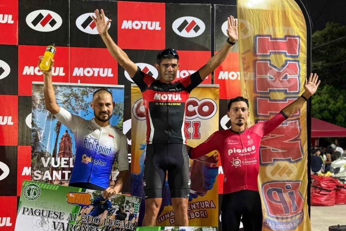 David Rojas, Iván Escudero y Camilo Castiblanco, en el podio de la primera etapa de la Vuelta Santa Cruz 2025. (Foto Facebook © Ciclismo Bolivia Informa)