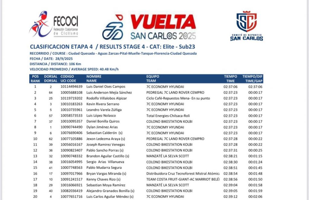 El colombiano Luis Anderson Mejía (Pedregal-7C -Landrover) se convirtió en el nuevo campeón de la Vuelta Ciclista San Carlos 2025, una de las carreras más tradicionales del calendario de Costa Rica, que constó de cuatro etapas.