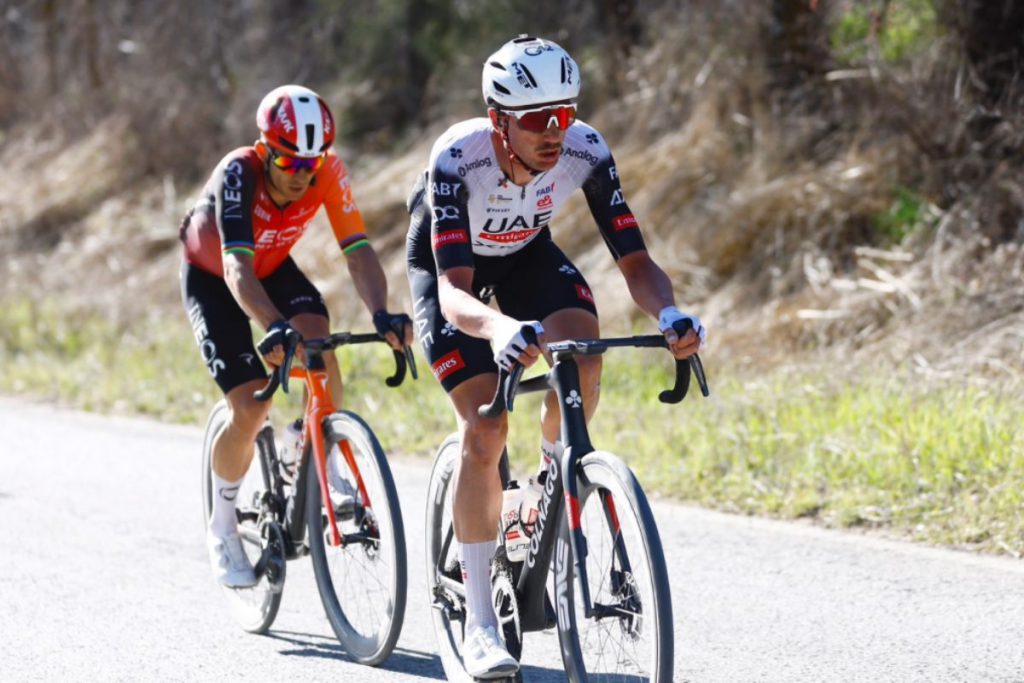 En el tramo final de sterrato, Brandon McNulty (UAE Team Emirates – XRG) sufrió un pinchazo, y se quedó de la punta, en la que solo quedaron el polaco Michał Kwiatkowski (INEOS Grenadiers) y el español Ibon Ruiz (Equipo Kern Pharma).