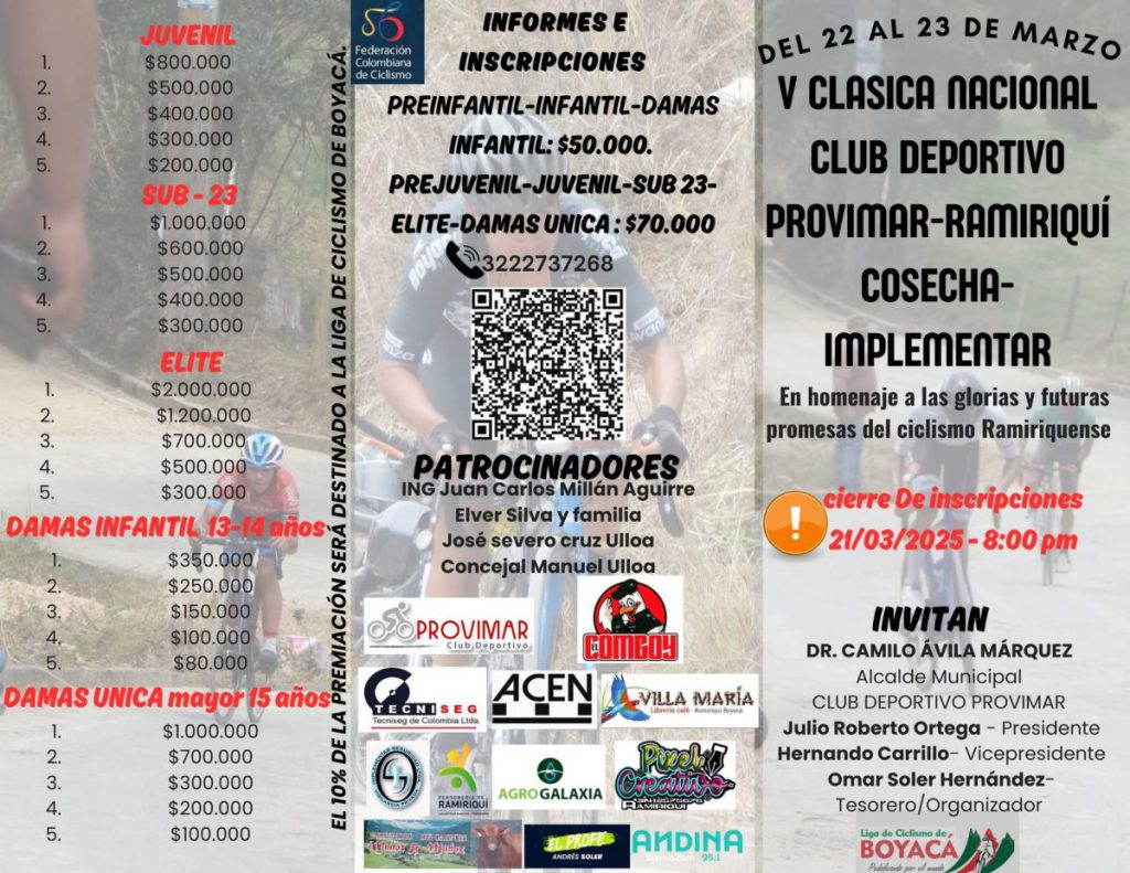 En Ramiriquí está todo listo para la quinta Clásica Nacional Club Deportivo Provimar, carrera que se desarrollará los días 22 y 23 de marzo de 2025. La novel prueba boyacense tendrá en competencia ocho categorías; preinfantil masculino, infantil masculino, prejuvenil, juvenil, damas infantil, damas única, sub-23 y élite.