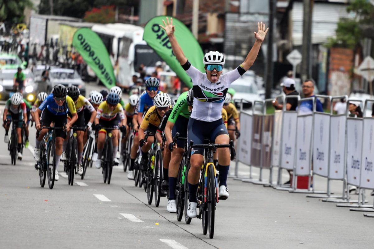 La joven corredora antioqueña del Team Sistecrédito firmó el triunfo en la capital del Quindío tras superar en el sprint a su compañera de equipo Yalecza Valentina Marín y a María Paula Rodríguez (Casanare), quienes entraron 2° y 3°, respectivamente.