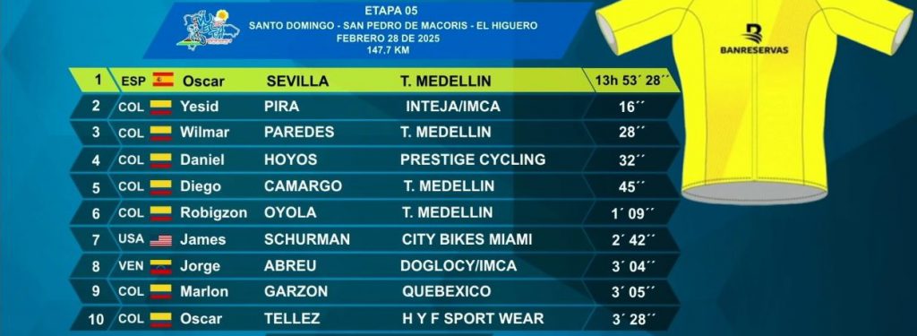 El experimentado pedalista colombo-español Óscar Sevilla del Team Medellín-EPM, sigue líder de la edición 46 de la Vuelta Independencia Nacional de República Dominicana, luego de defender el liderato en la quinta etapa, de 147 kilómetros, que se disputó entre Santo Domingo y El Higüero.