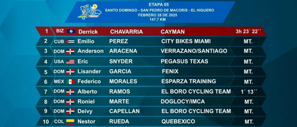La quinta fracción quedó en manos del beliceño, Derrick Chavarria (Phoenix Internat Cayman), que le ganó en el embalaje al cubano Emilio Pérez (City Bikes Miami ), mientras que el mejor colombiano del día fue Néstor Rueda (Quebexico-Iowa latino), cerrando el top 10.