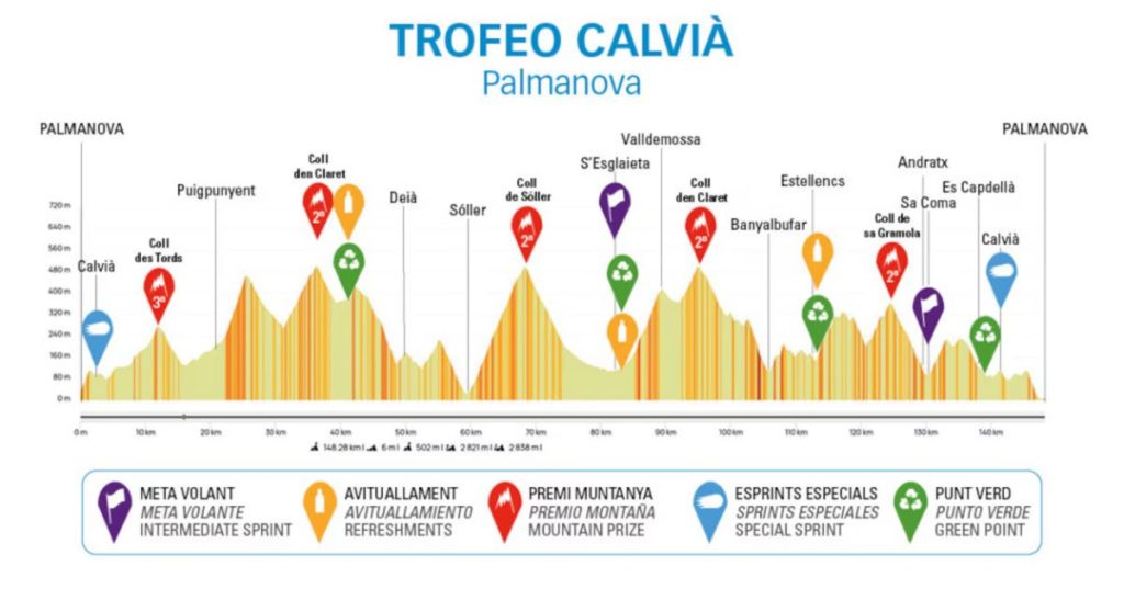 La jornada inaugural de la Challenge de Mallorca contó con un recorrido montañoso que incluyó las subidas cortas al Coll des Tords (6,6 km al 2,5%), Coll den Claret (5 km al 4,7%), Coll de Sóller (8,4 km al 5,5%) y a Coll de Sa Gramola (3,1 km al 5,2%). Después del último tramo repleto de ascensos, el pelotón afrontó varios kilómetros ondulados hasta la meta en Palmanova.