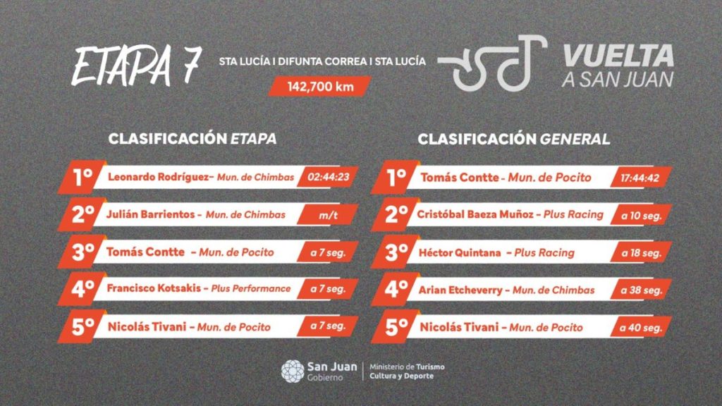 En cuanto a la clasificación general todo siguió igual en los primeros puestos. El gaucho Tomás Contte (Municipalidad de Pocito) mantuvo el liderato, mientras que el chileno Martín Mancilla (Stamina Racing) lidera en la categoría sub-23.