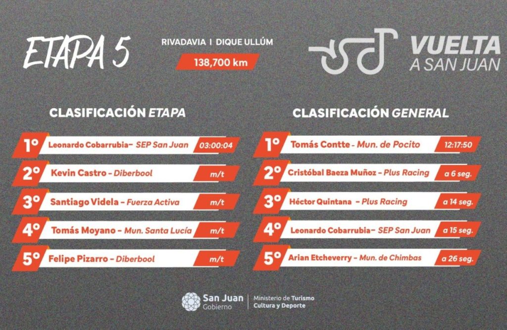 En cuanto a la clasificación general todo siguió igual en los primeros puestos. El gaucho Tomás Contte (Municipalidad de Pocito) mantuvo el liderato, escoltado por el chileno Cristóbal Baeza (Plus Racing).